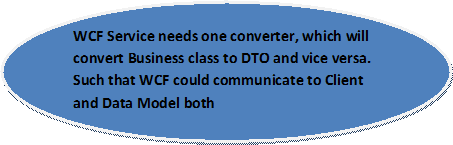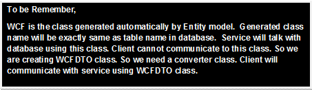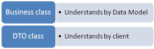 This is a normal class, which WCF or service uses to communicate with the client. This class is exposed as Data Contract . WCF cannot put Data Contract on the class which is having constructors and methods. So, the business class generated by ORM (here it is Entity model) having methods, constructor and all. And that cannot be exposed as Data Contract. So we need some converter which will convert business class to DTO and DTO class to Business class.