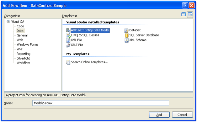 Right click at the project in solution explorer. And select Add New Item. From the dialog box click on Data tab and select ADO.Net Entity Model. From here create an entity model. Give some name and click on Add. After that click on Next.