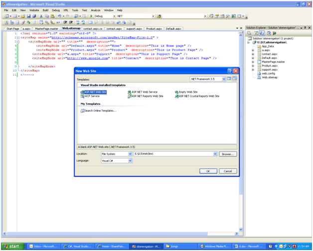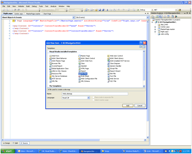 Add a New Site Map to the Project. Click the right mouse button on the project in solution explorer . Select Site Map from the template. Keep the name Web.sitemap as it is. This is default name for Site map.