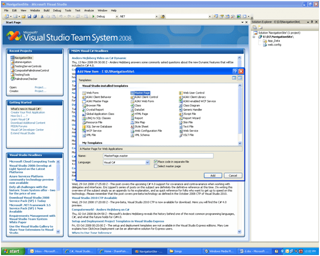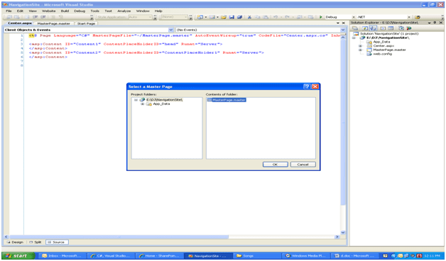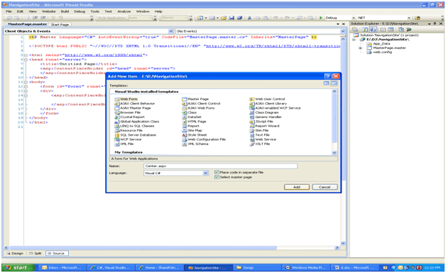 Create a Master page for the Web Site. Click the right mouse button on the Project node to solution and select Add New Item. Choose Master Page from the template. Keep default name. Click ADD.