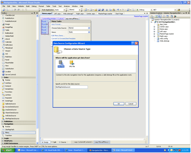 of menu or select its property . Click on Choose Data source then select New Data Source. After new Data source select SiteMap and press ok.