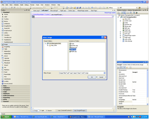 - Drag a Image Control on Left.aspx , Right.aspx, center.aspx and Home.aspx.