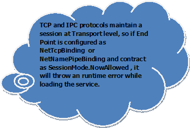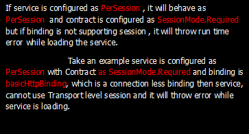 If a contract is configured as SessionMode.Required with a service end point who’s binding does not maintain a Transport level session a Run time error will encountered at loading of service.