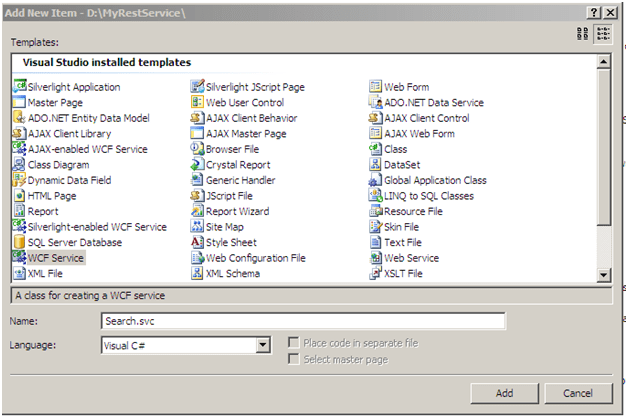 Right click on the project in solution and add WCF Service as new item. Give any name to the service. I am giving Search.svc.