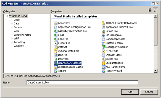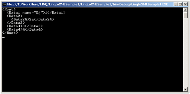 In below sample, we are creating a simple XML. Elements are as Data1, Data2 and so on. Data1 element is having a property called name with the value Dj. We are using XElement and XAttribute classes from LINQ to XML API to achieve this task.