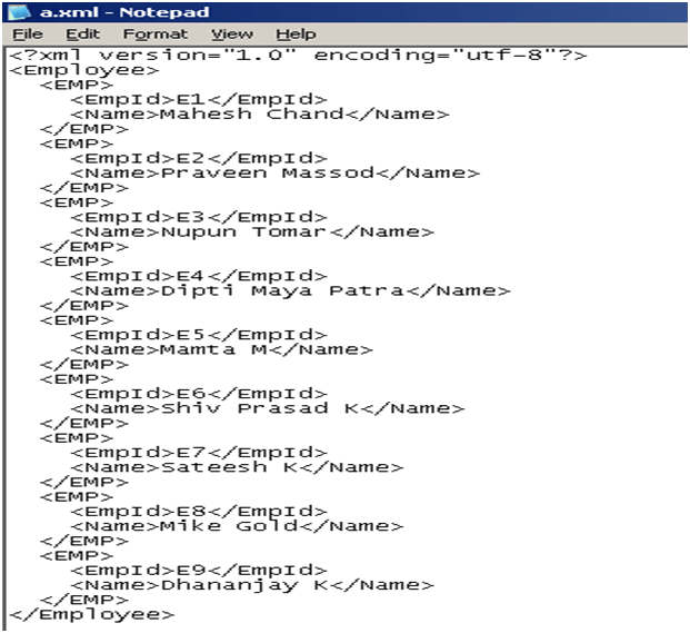 So to save the XML tree in a XML file in Sample 3, just we need to call Save method as below. XML Tree will get saved in a.xml at location E local drive.