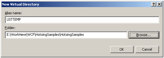 Give any Alias name for the Virtual directory of your choice. USTTEMP is alias name here. After giving alias name browse to the folder where Service is residing. Here service is saved in E:\\WorkHere\WCF\HotsingSample folder.