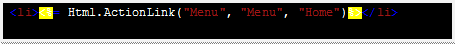<li><%= Html.ActionLink(“Menu”, “Menu”, “Home”)%></li>