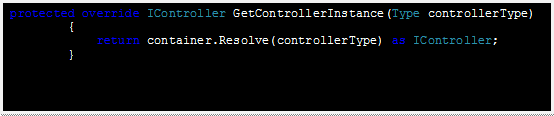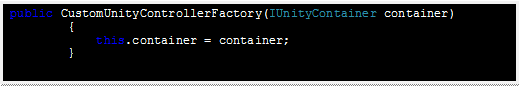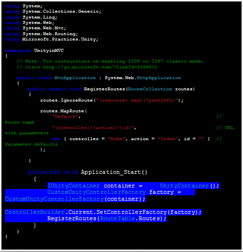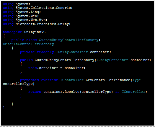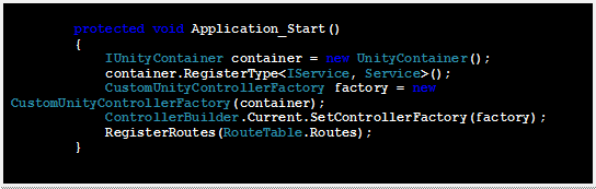 - Set the CustomUnityControllerFactory as the default controller factory to be used. For this call Current method on ControllerBuilder and pass instance of CustomUnityControllerFactory in that. (see below code in blue)