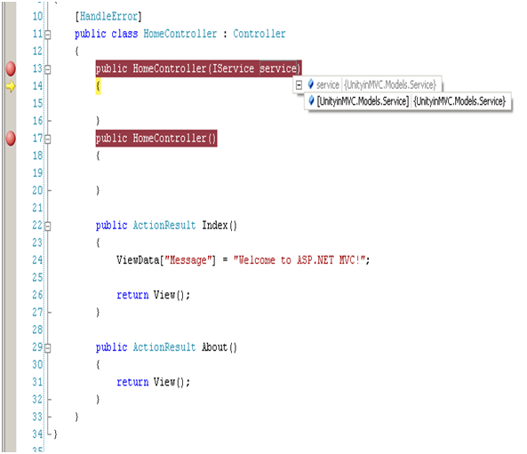 Now put a breakpoint at constructor of HomeController and run the application. We could see while debugging that dependency has been injected.