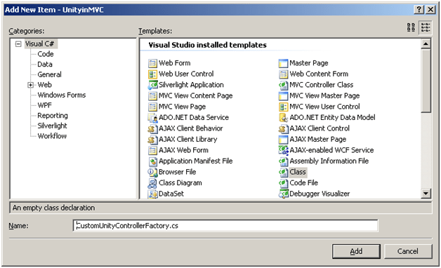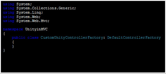Idea here is to create a custom controller factory. This custom controller factory will create the controller and inject the dependencies in that. Add a class to the project. Feel free to give any name; here name of the class is CustomUnityControllerFactory.