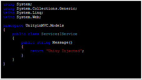 Now it is time to check that, how Custom Unity Container Factory is working. To test that, we will create a service interface and concrete service class in Model.