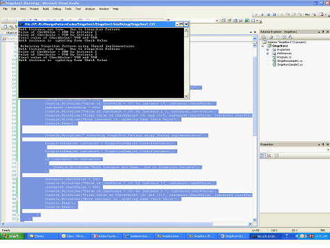 Console.WriteLine(” Acheiving Singelton Pattern using Thread implemenetaion”);