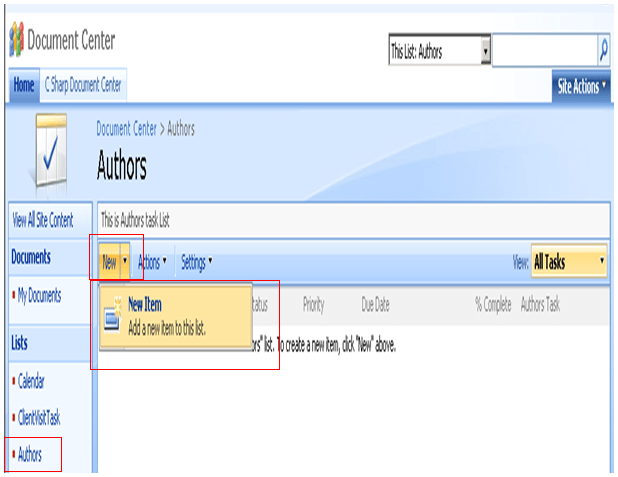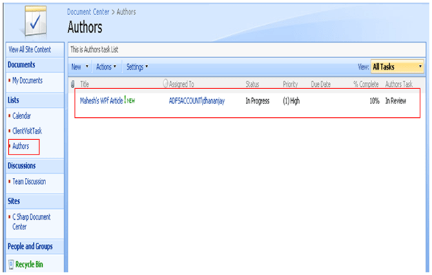 Congratulation, you have created a New task list with an item added in that. Now to view the list click on Authors task list in quick launch to view the list.