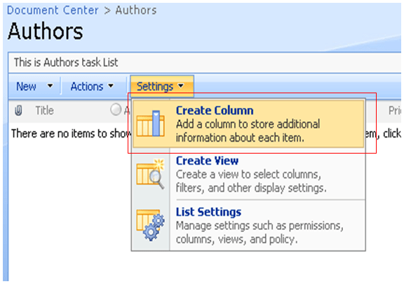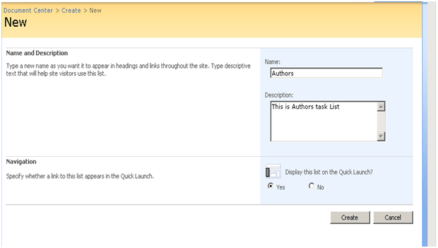 Give name Authors. Give Description as “Authors Task List”. Select “Yes” for show in quick launch. Click on Create to create the Task List.