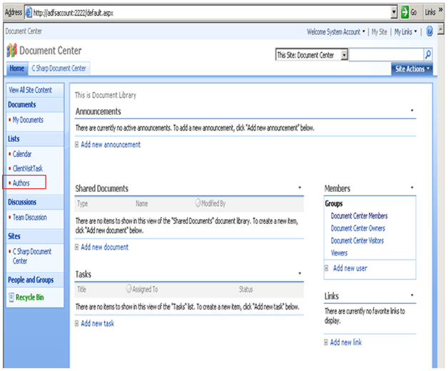 Now you would able to see, newly created Task list in quick launch of SharePoint site. So Authors task list is listed in quick launch.
