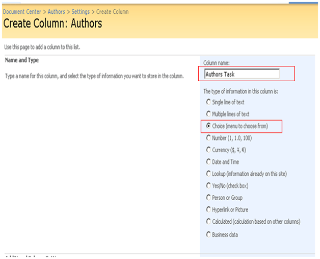 Click on Authors in quick launch. Then click on Setting and then on Create Column.