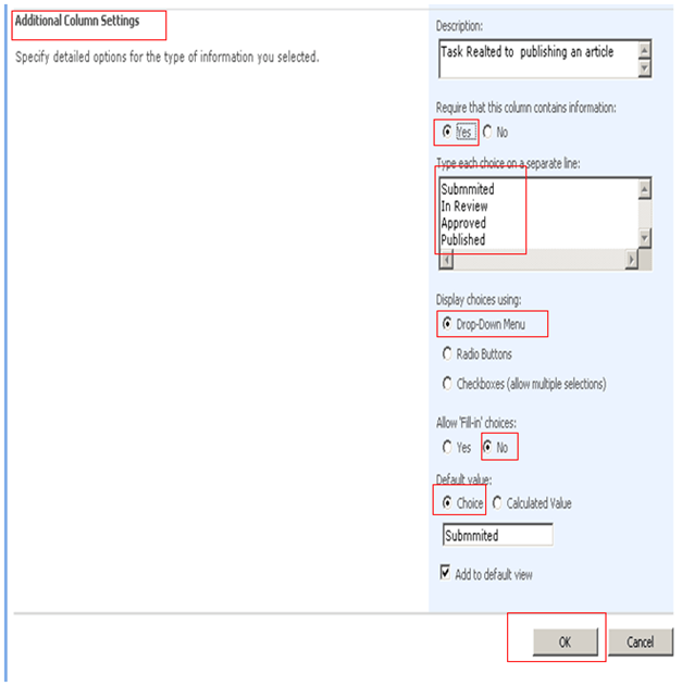 Give Description. For require information filed select Yes. Type choices. Choices are as Submitted, In Review, Approved and Published. For Display Choices select Drop Down menu. For Default value select the first one. After giving all these values click Ok to create the column.