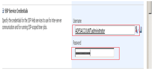 Provide username and password for the account under which you want to run the SSP. Please make sure user is a domain user. User is not member of any security group.
