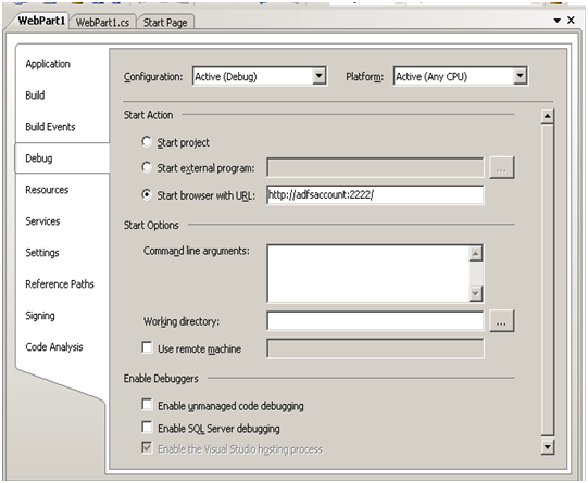 To deploy put the link of the site collection. Where you want to deploy the web part. Right click on Solution then properties then click on Debug tab. In Start Browser field put URL of site collection.