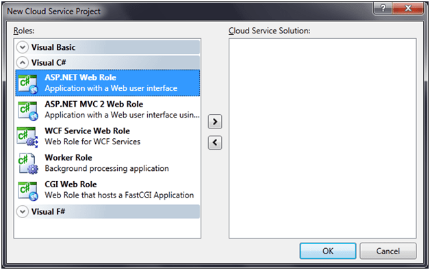 Open Visual Studio 2010 as an administrator. Select File -> New -> Cloud Service. Click on Windows Azure cloud service template. Give name of the cloud service. After creating the cloud service select the type of role. There are many roles to choose from. For our purpose, we will choose ASP.Net Web Role.