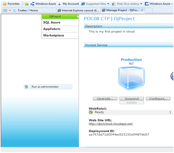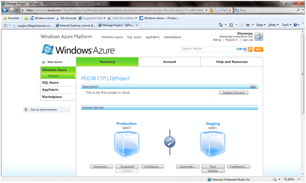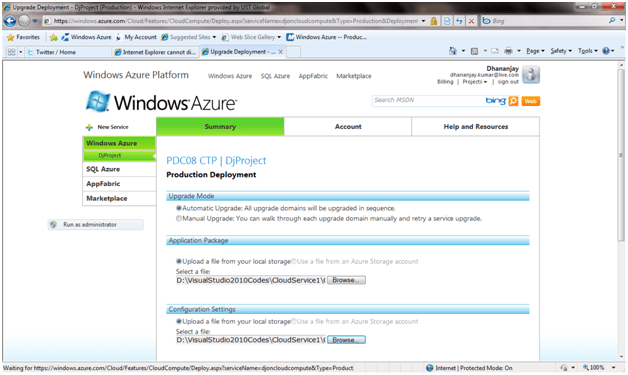 Since, I have already hosted in the project before. So I am getting the upgrade option. First time, you won’t get upgrade option. First time on creation of Windows azure project it will ask you to give an URL for your project . Just give an URL, which you will use to access your application across.