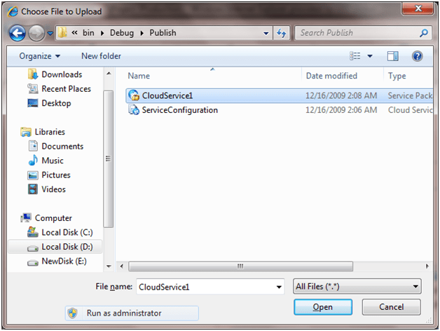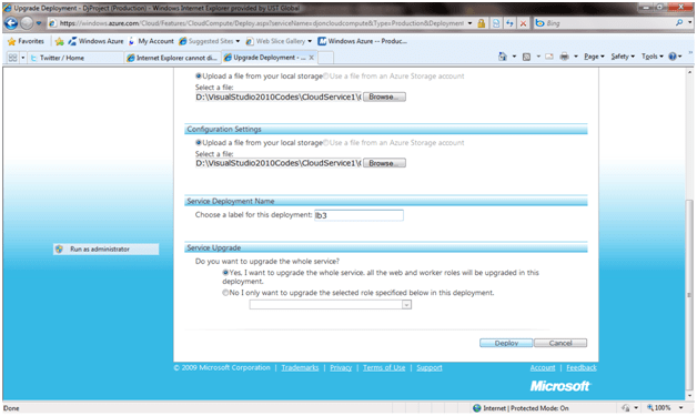 Click on upgrade option . It will ask for the package file and config file. Browse to CloudService1\bin\publish folder. CloudService1 is name of the application. It may be different in your case , depending on what name you have given in step1.