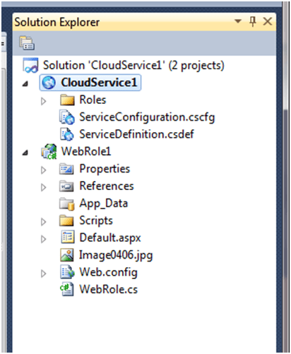 Now examine the solution explorer. There should be 2 projects. Called WebRole1 and CloudServices1. These names may different basis of the name you given at time of creation of cloud service project in step1.