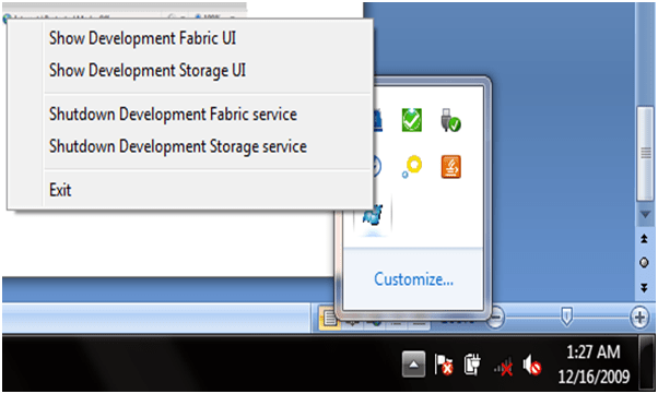 On clicking at task tray; Local Development Fabric icon would be there. Right click on the icon will give below options as of below diagram.