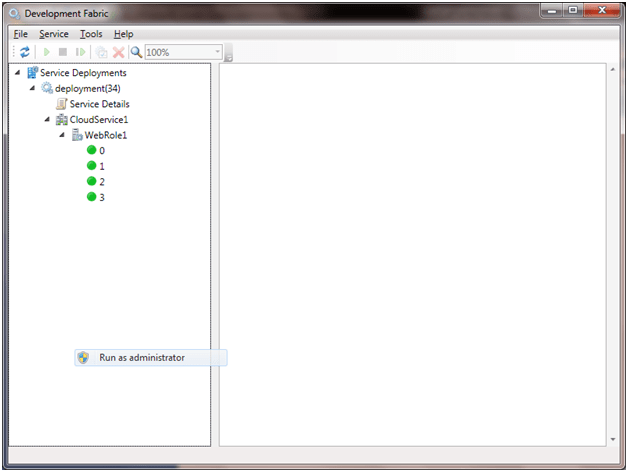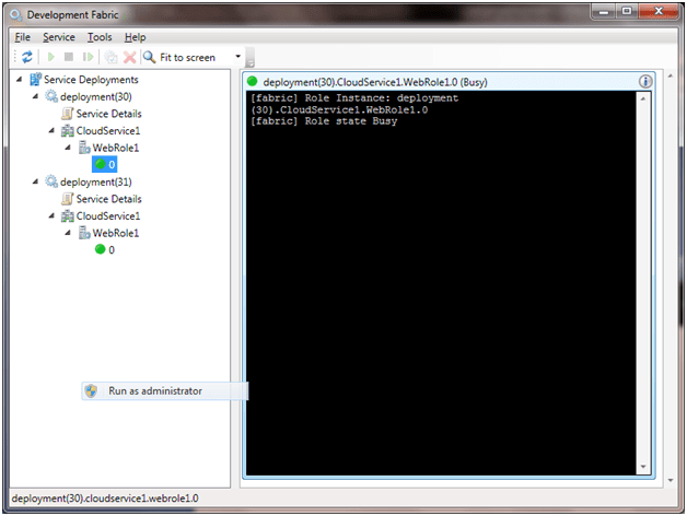 Click on, Show Development Fabric UI. It will open the UI. This UI will show state of all the instances running for the different types of roles.