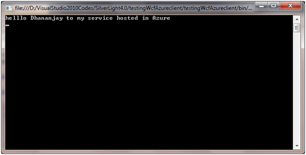 | using testingWcfAzureclient.ServiceReference1; namespace testingWcfAzureclient {class Program{ static void Main(string[] args) { DjServiceClient proxy = new DjServiceClient(); Console.WriteLine(proxy.GetMyName(“Dhananjay “)); Console.Read(); }}} |