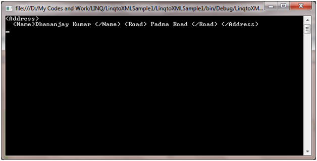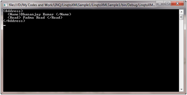 | XElement xmltree = XElement.Parse(@”<Address><Name>Dhananjay Kumar </Name> <Road> Padma Road </Road> </Address>”);