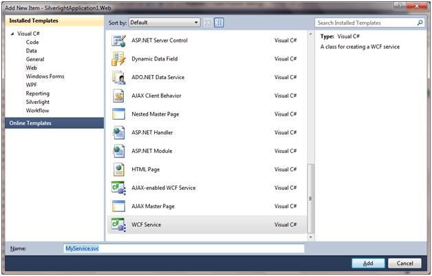 Right click on Web Project and add WCF service from Web tab. Give any name of your choice, I am giving name here MyService.