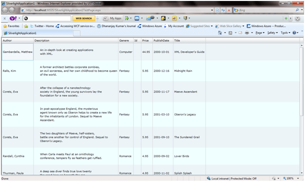 | using System; using System.Collections.Generic; using System.Linq; using System.Runtime.Serialization; using System.ServiceModel; using System.Text; using System.Web; using System.Xml.Linq; namespace SilverlightApplication1.Web{ XDocument xmlDocument = XDocument.Load(@”c:\\Books.XML”); Title = r.Element(“title”).Value,Genere = r.Element(“genre”).Value, Price = r.Element(“price”).Value, PublishDate = r.Element(“publish_date”).Value, Description = r.Element(“description”).Value, }; } } } |