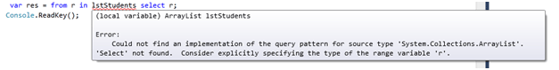 So , how to query an ArrayList? Here Range variable comes into action. If I modify the above query as below , I would be able to query LINQ against a non IEnumerable<T> collection.