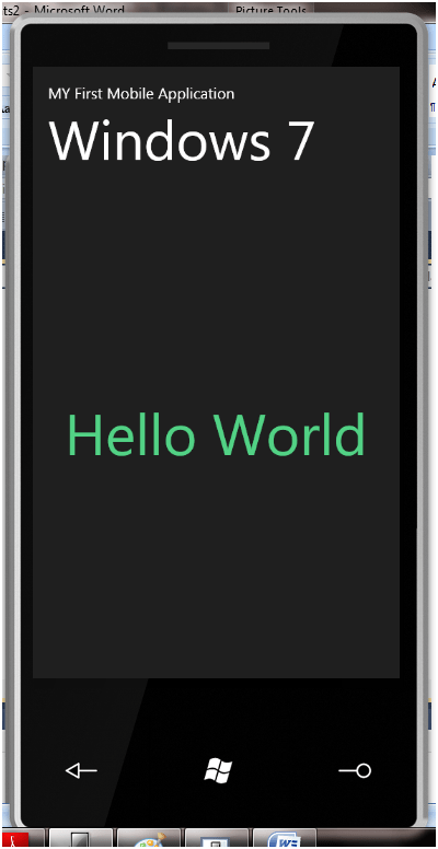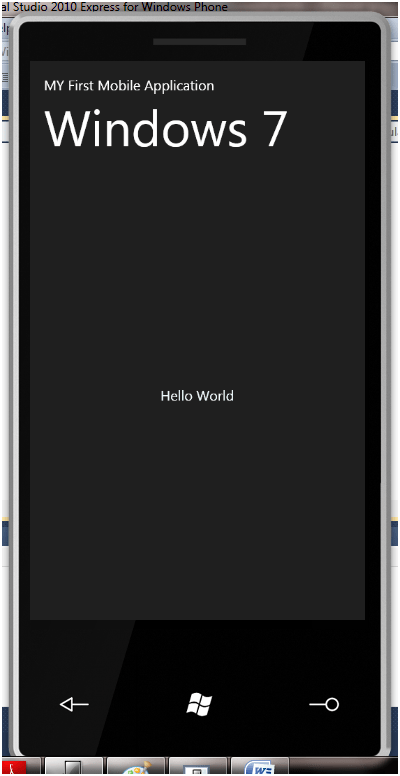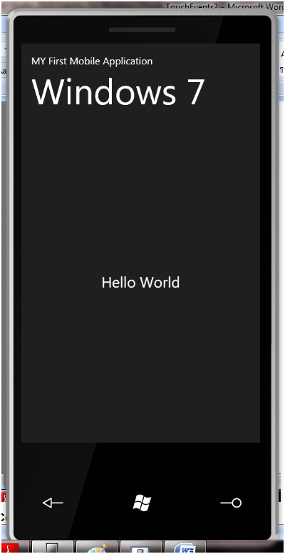 Just press F5 and in Windows 7 mobile emulator you can see the output. In center you can see Hello world. When you click on the text block, font of the text will be changed to 75 and foreground color will change randomly. But when you click outside the text block or any other place on page text font size will be changed to 30 and text color to white.