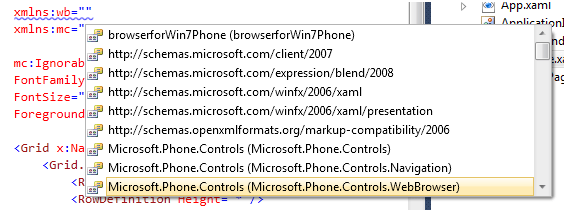 xmlns:wb=”clr-namespace:Microsoft.Phone.Controls;assembly=Microsoft.Phone.Controls.WebBrowser”