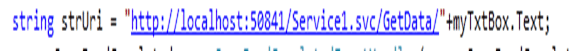 32 string strUri = “http://localhost:50841/Service1.svc/GetData/”+myTxtBox.Text;