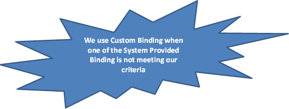 Custom Binding provides the full control over the messaging stack for the user. We use Custom Binding, when none of the system provided binding is matching our requirement. For example let us say, your requirement is to use Http protocol to send SOAP12 message version.