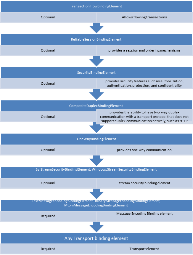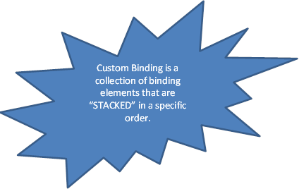 Each Binding is made of different binding elements. We can construct a Custom Binding from a set of system-provided binding elements. System-provided binding elements are stacked in a specific order and we need to follow that order while creating a custom binding. Few binding elements are optional in the stack and few are required in binding elements stack.