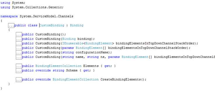 Custom Binding is constructed using CustomBinding class. The class is defined as below