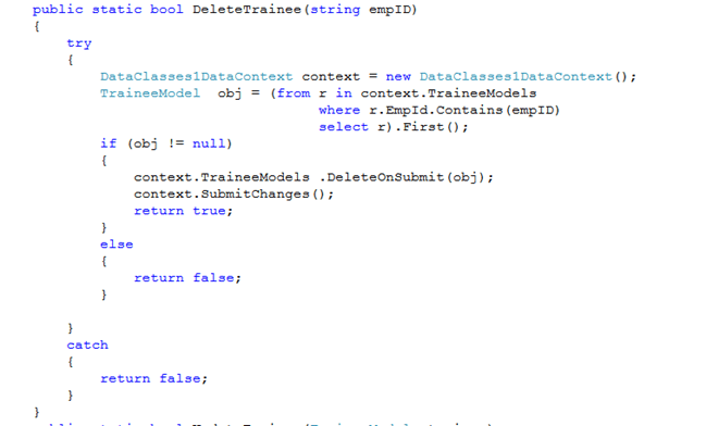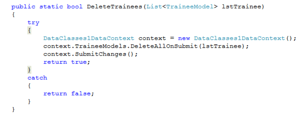 109 public static bool DeleteTrainees(List<TraineeModel> lstTrainee)