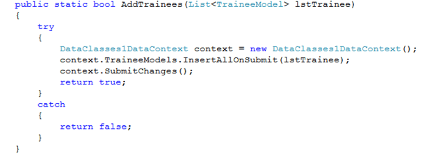 - Input parameter to this method is List of TraineeModels to be inserted.