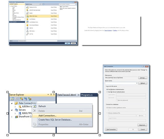 - Right click on the project and add new item and select LINQ to SQL Class from Data tab.