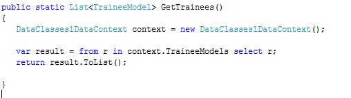 - I applied simple LINQ query to retrieve all the records from the table TraineeModels in data context.
