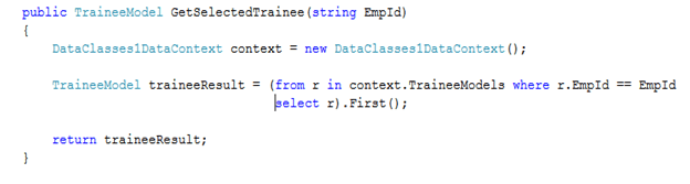 23 TraineeModel traineeResult = (from r in context.TraineeModels where r.EmpId == EmpId