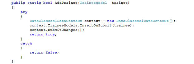 94 public static bool AddTrainees(List<TraineeModel> lstTrainee)