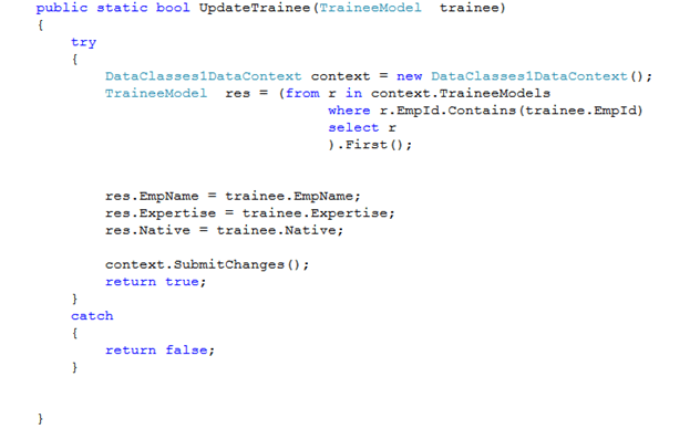 69 public static bool UpdateTrainee(TraineeModel trainee)