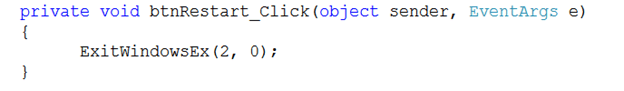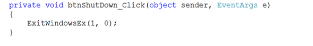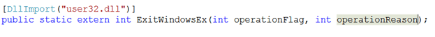 public static extern int ExitWindowsEx(int operationFlag, int operationReason);