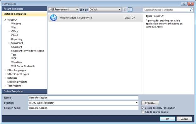 Open visual studio. Create a new project by selecting New from File menu. Then from AZURE tab select Windows Azure Cloud Service project.